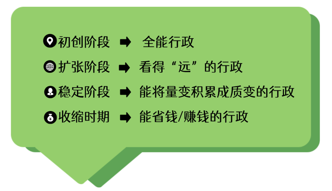 ◎扩张阶段的企业更需要有观察力的行政,将行政工作事项前置以快速匹配业务需求;