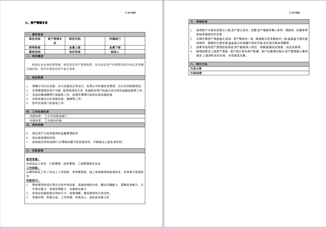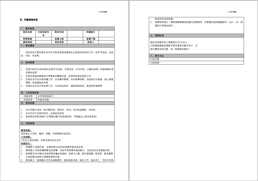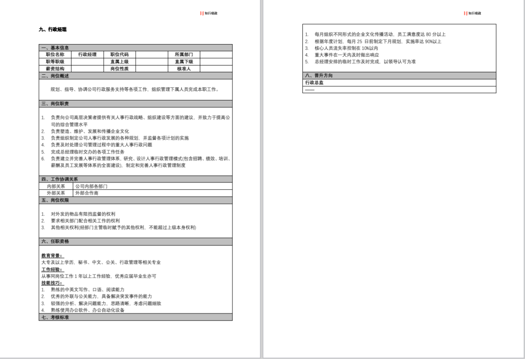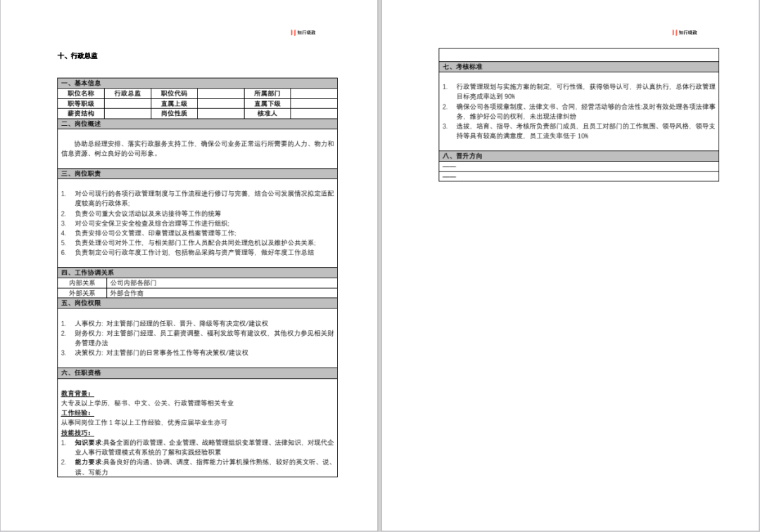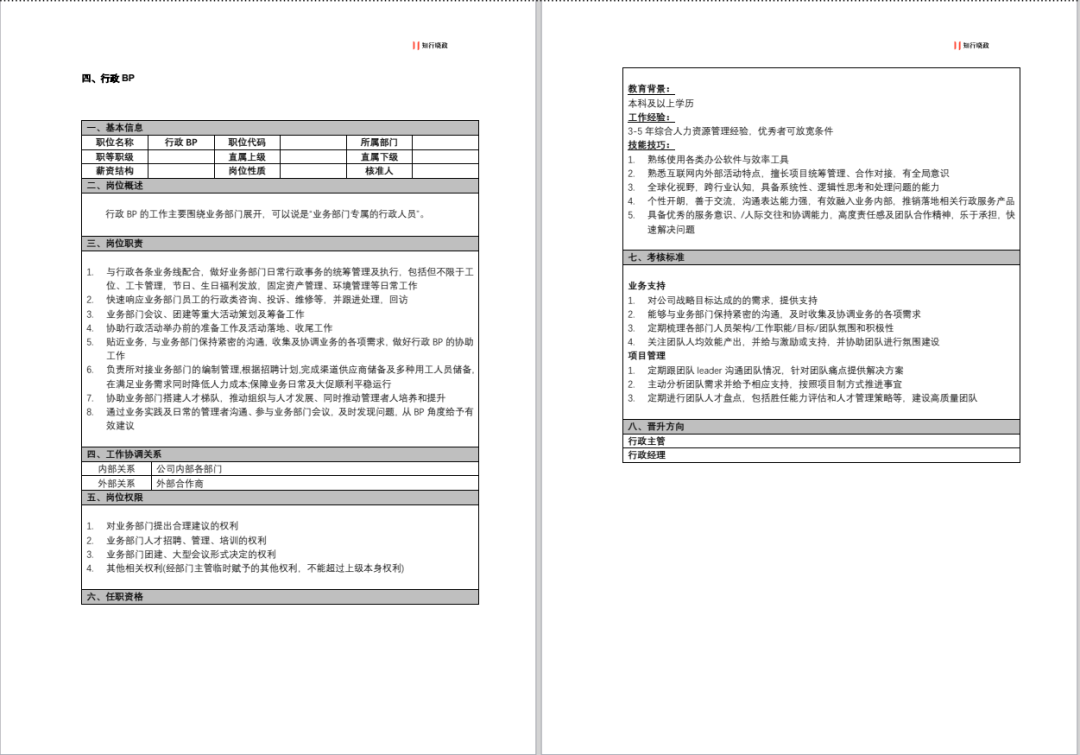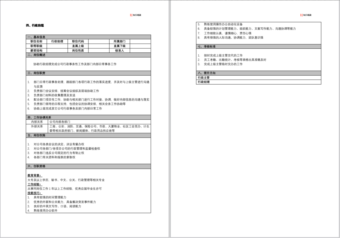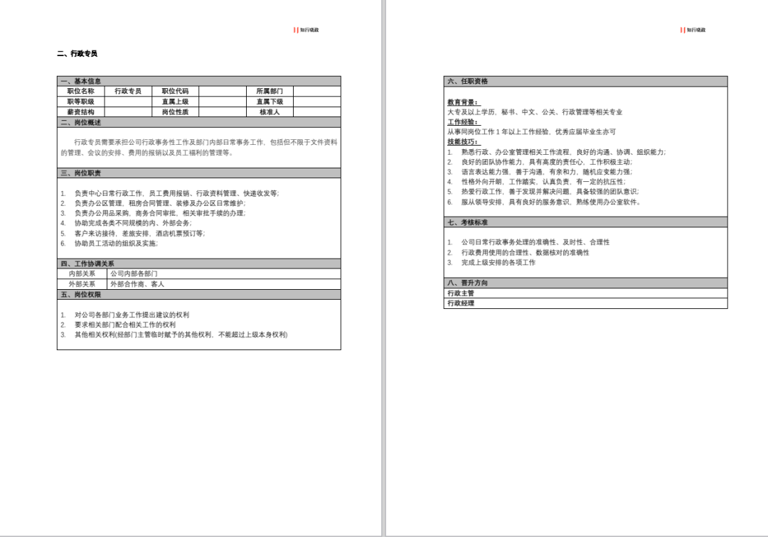 以上就是给大家分享的行政各岗位说明书范本了,实际应用的时候大家根据自己公司的情况稍加修改就可以啦。微信公众号【知行晓政】后台回复“行政岗位说明书”即可获得文章中的表格。