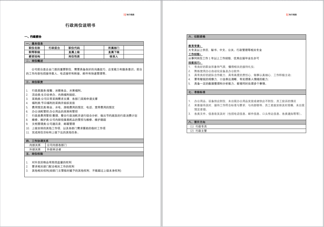 既然它扮演着这么重要的角色,那么,一份完整的行政岗位说明书应该是什么样的呢,下面一起来跟小知看看吧~