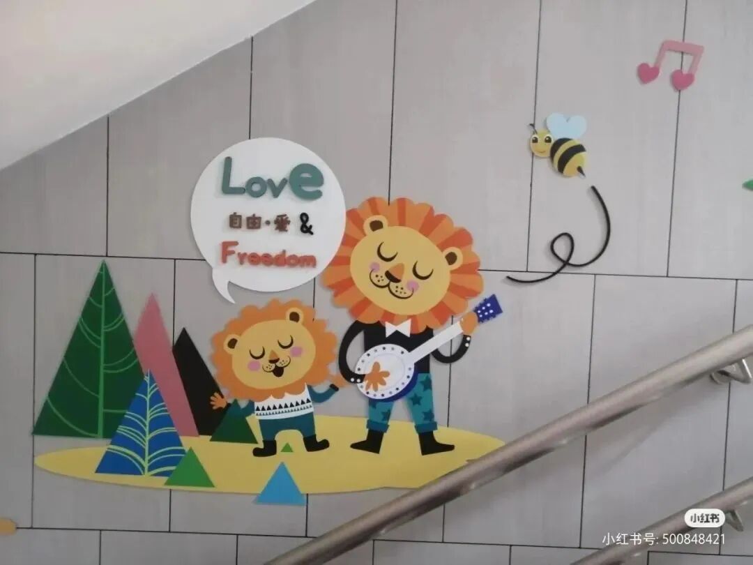 *胖东来在楼梯侧面利用插画和温馨语句打造充满趣味的文化空间