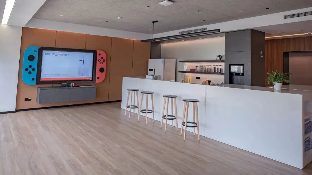 *强调“以人为本”的真有趣,将茶水间里的显示屏幕做成一个超大“Switch”,还布置了沙发,鼓励大家工作累了来这里放松一下。