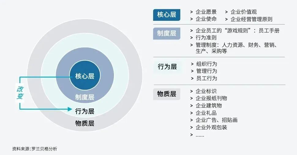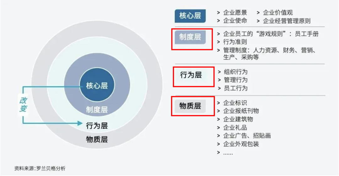 先进行企业文化的宣贯,具体方法可以结合圈层图中的物质层,用物料/课程等来落地;