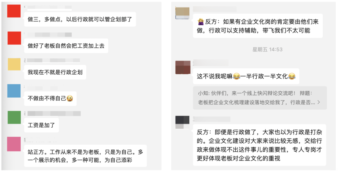 这个情况并非个例,因此前些天小知在社群里发起了一次线上快闪辩论,想与大家探讨一下企业文化工作到底谁来做。