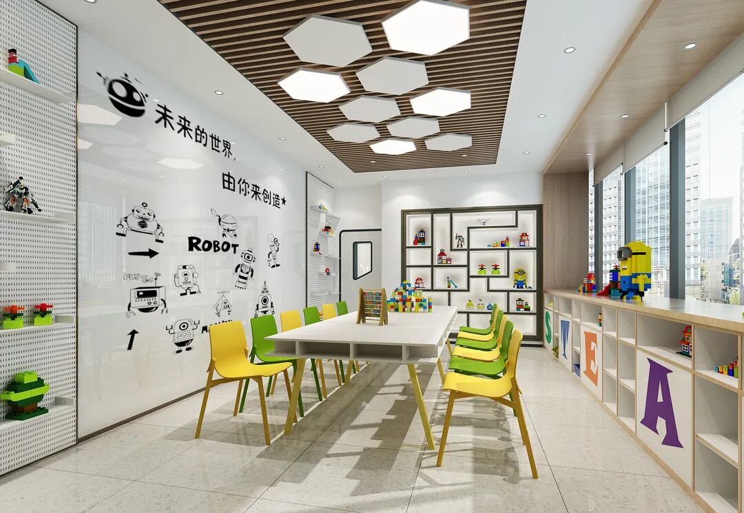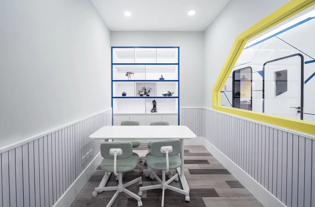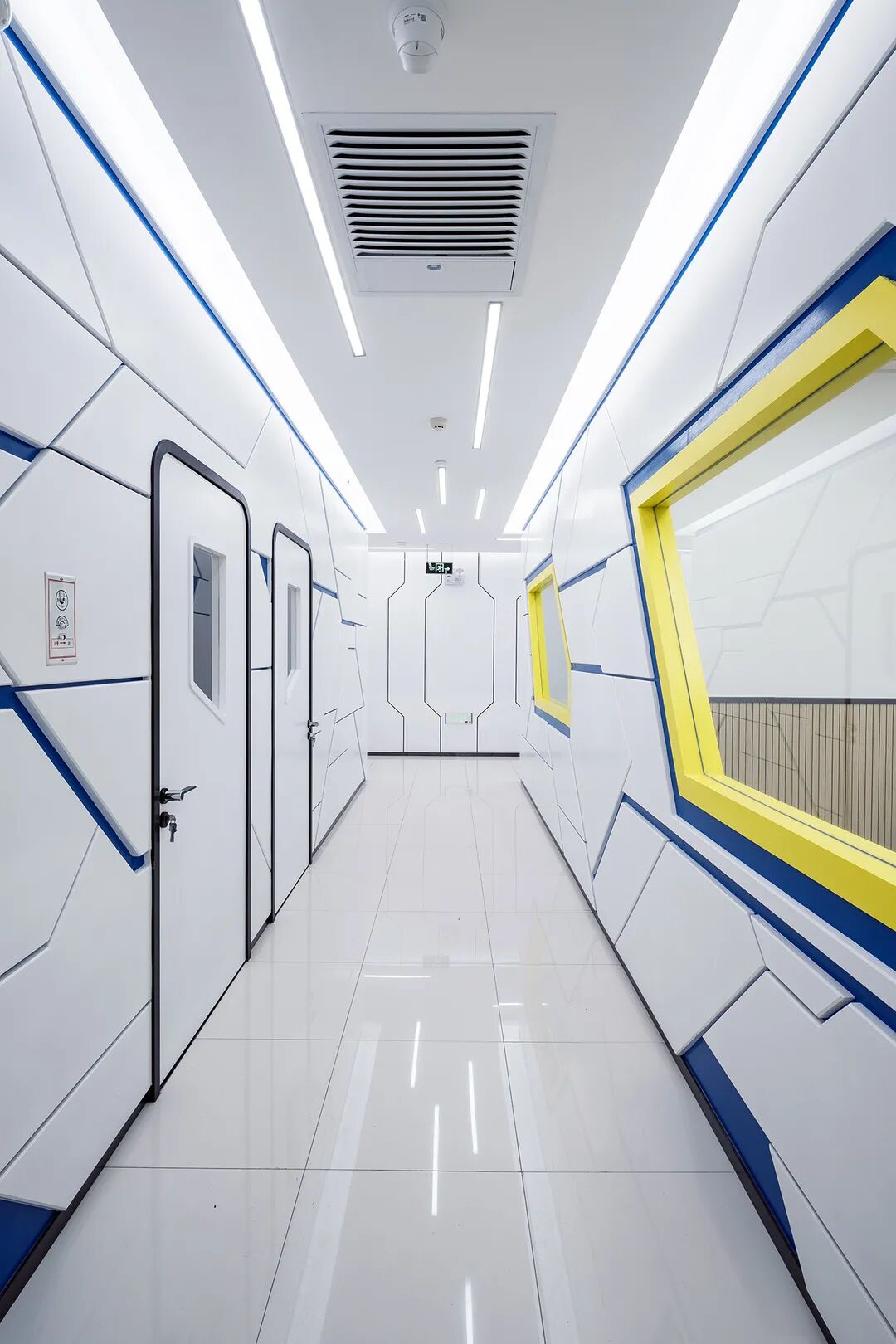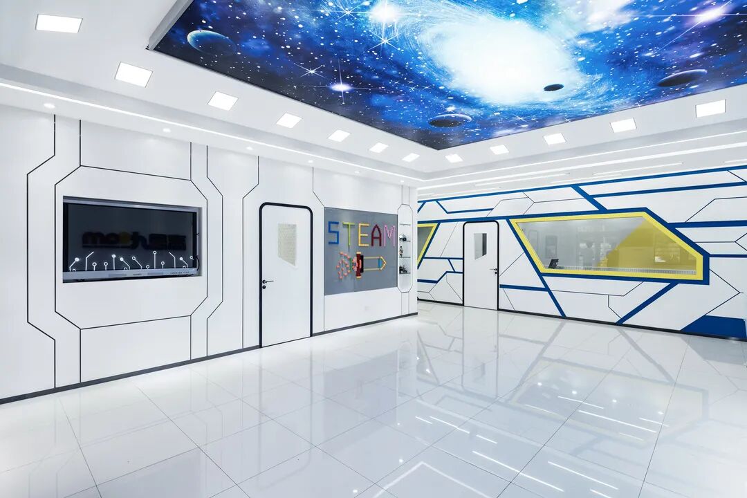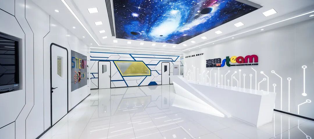 高思教育集团整体空间以科技元素为主,墙面线条由太空舱元素来设计,包括教室门都是太空舱感觉。营造一个科幻环境,通过氛围培养学员的逻辑思维能力、想象力和创造力、综合学科能力。