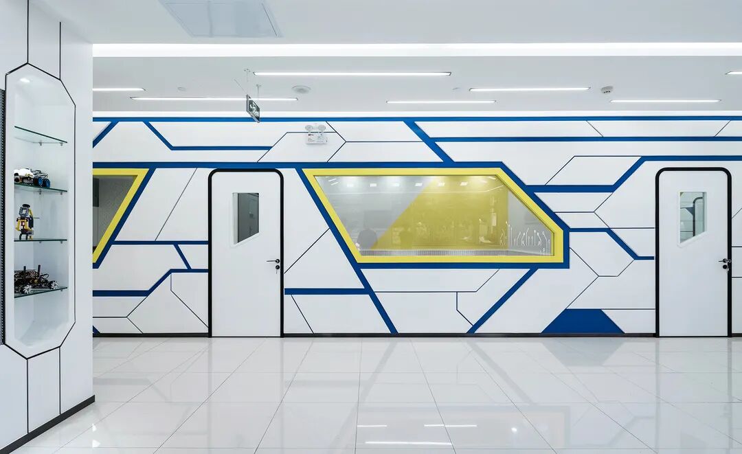 高思教育集团前厅以具有高辨识度的纹理动态造型、人工智能AI元素、科技蓝的墙面线条和鲜明的色彩,结合优雅的白色,构建了一个精彩的科幻空间。