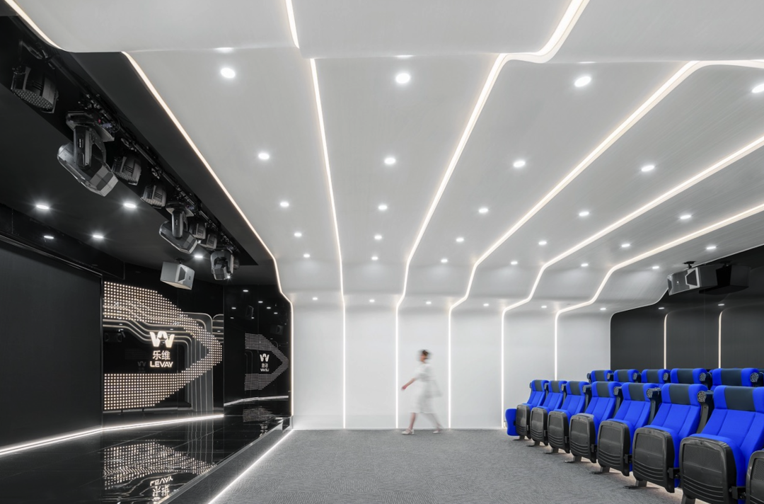 有企业发布会等场景需求的,可以把大会议室打造成一个发布会现场!黑色舞台、线条灯带以及蓝色座椅,让乐维的会议室充满科技感。