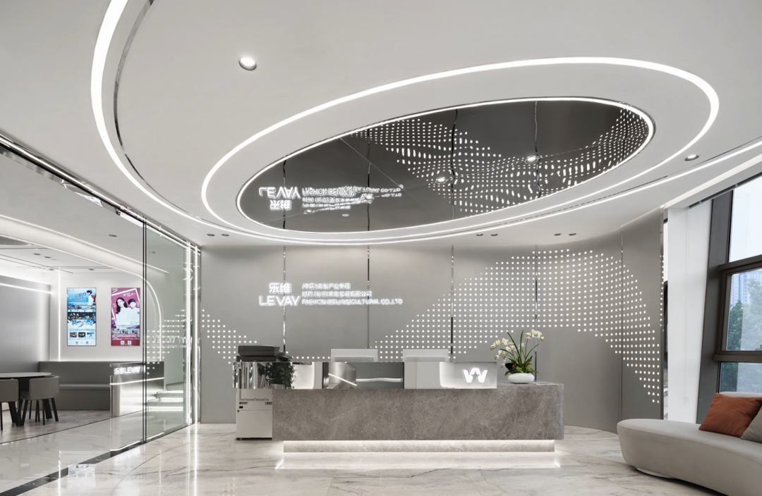 访客从中心电梯厅进入宽敞的接待大厅,其极具视觉冲击力的独特设计带来强烈的视觉印象,一展乐维文化年轻、富有活力的公司文化氛围。