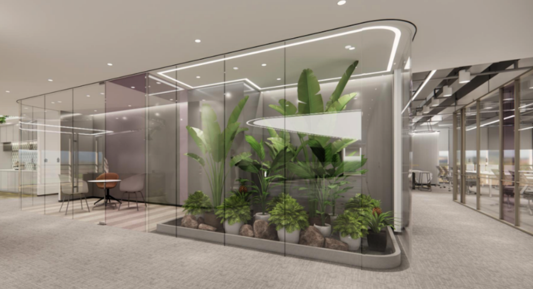 梵华怡居用全透明玻璃和高大绿植打造会议空间,同时也让它成为空间里的一处景观。