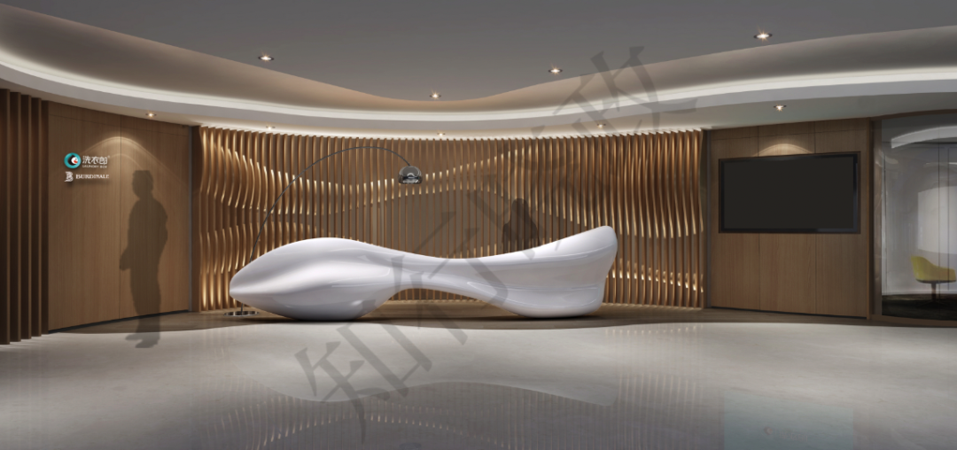 洗衣朗为了展现公司的主要洗衣业务,设计师大量运用了曲线的造型,伴随着轻盈反光的前台向上层层递进,营造透明悬浮的空间感受,犹如水波一样在微风的吹拂下上下起伏。
