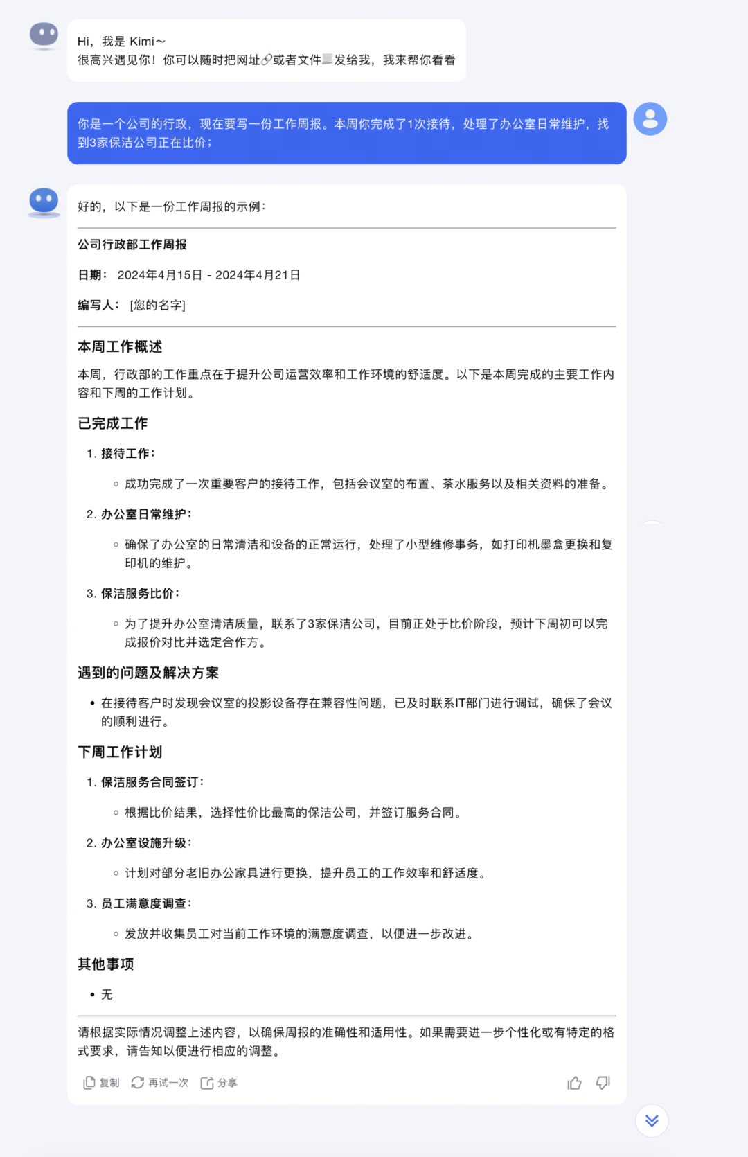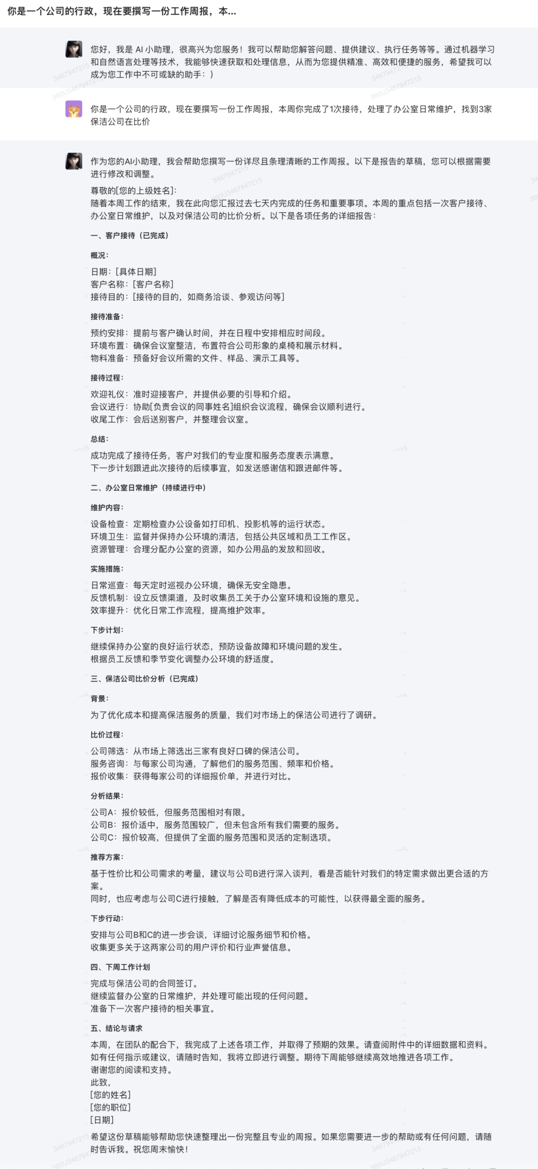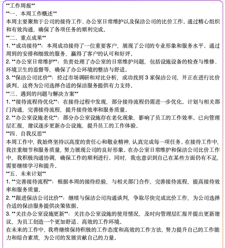 测试命令:你是一个公司的行政,现在要写一份工作周报。本周你完成了1次接待,处理了办公室日常维护,找到3家保洁公司正在比价
