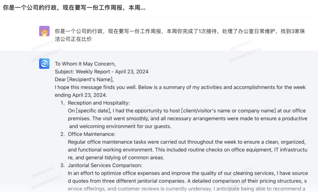 一开始,小知选择的对话角色是360智脑,给出周报撰写命令,它给到的是全英文版,差点以为要去考级。