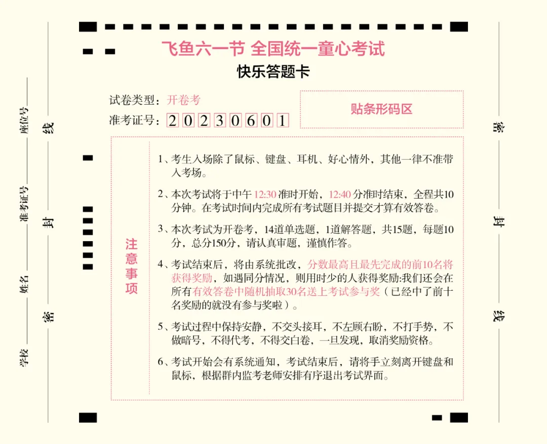 去年六一,飞鱼在内部为“大孩子”们筹办了一场全鱼统一的「童心考试」,考试范围涵盖:童年影视、童年动画片、童年广告、古诗词、算术题等。还为大家准备了精美的奖状与惊喜奖品。