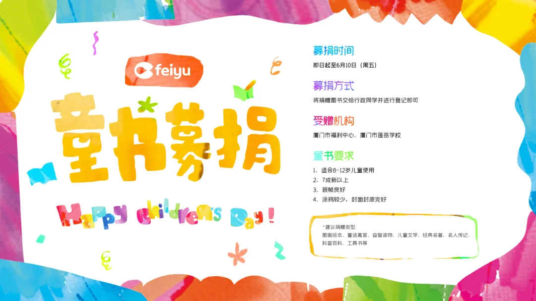 而前年儿童节飞鱼科技同样策划了一场公益活动,在集团内部发起了一场「童书募捐」活动,向各位鱼er征集家中闲置的优质儿童读物,并与集团出资采购的新图书一起,定向捐赠给厦门市福利中心、厦门市莲岳学校等机构。