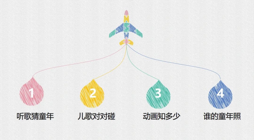 还可以设计成闯关大比拼游戏,根据提示来猜童年的儿歌、动画、照片等,通过答题来累计基本,兑换礼品。