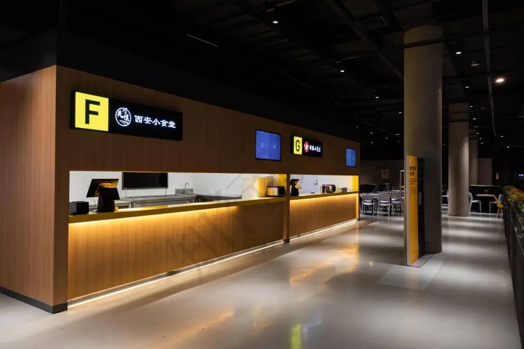 美餐负责数码庄园百时乐员工餐厅项目,采用多种用餐方式搭建园区餐厅,位于北京经济开发区,设计风格上通过木色让深灰色的空间更显清新温暖,黄色作为空间唯一亮色调,给人以阳光和能量的氛围。