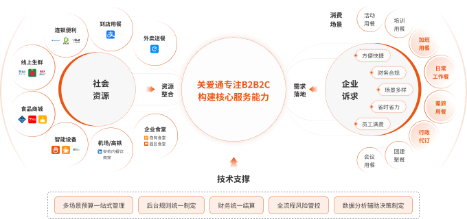 关爱通企业用餐解决方案,基于关爱通数字化全场景员工服务平台——“给到”,实现一键便捷分发,企业统一结算。汇集线上线下餐饮资源,覆盖企业用餐全场景,完善的预算管理、费用/流程管控、结算入账、数据汇集等功能,帮助企业有效提升企业用餐管理水平和效率。