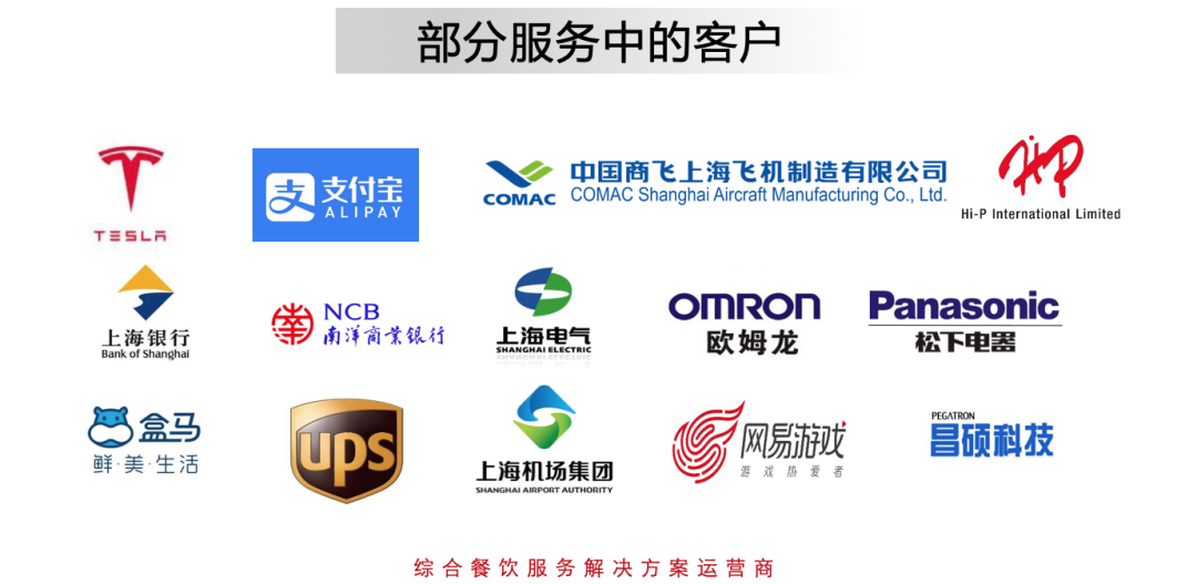 服务客户类型覆盖制造型企业、互联网科技企业、汽车制造供应链、航空系统、科技研发企业、国有事业单位、商务园区、办公写字楼宇等,目前每天为30余家来自亚洲、欧洲、美洲以及大洋洲的客户提供各种不同的、量身定制的服务和数以万计的美味食品,多年的专业经营经验赢得了众多客户的好评。