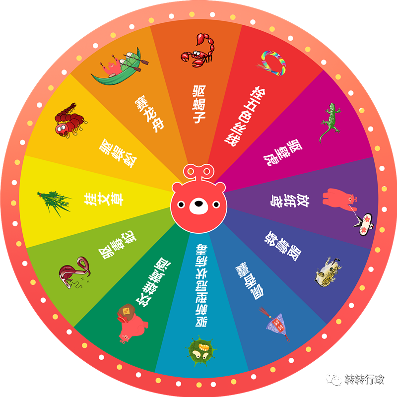 2020年转转端午订制幸运转盘,每人一次转动机会,指针指向「蛇、蝎、蜈蚣、壁虎、蟾蜍、新冠病毒」任何一项,即为驱毒成功。