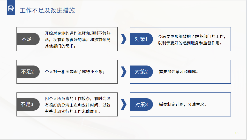 也可以像下面这样,只写不足和对策,更加简洁一些,其他内容可以在汇报时加以补充。