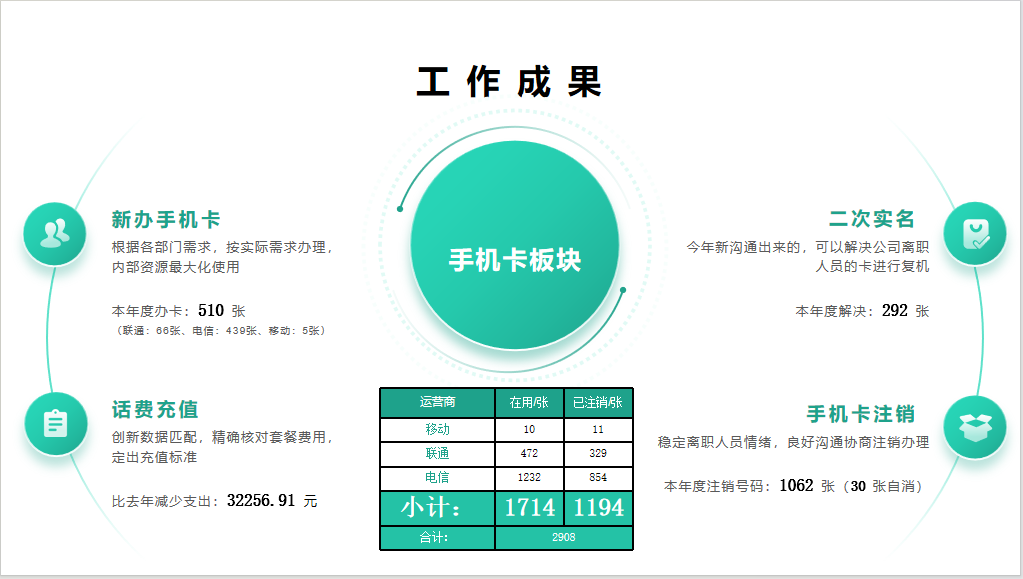 还有一点要注意的是,在呈现数据时,图片、表格和数字往往比文字更具冲击力。我们应优先使用这些方式来展示我们的成果,对于关键性的数据与文字进行突出展示。