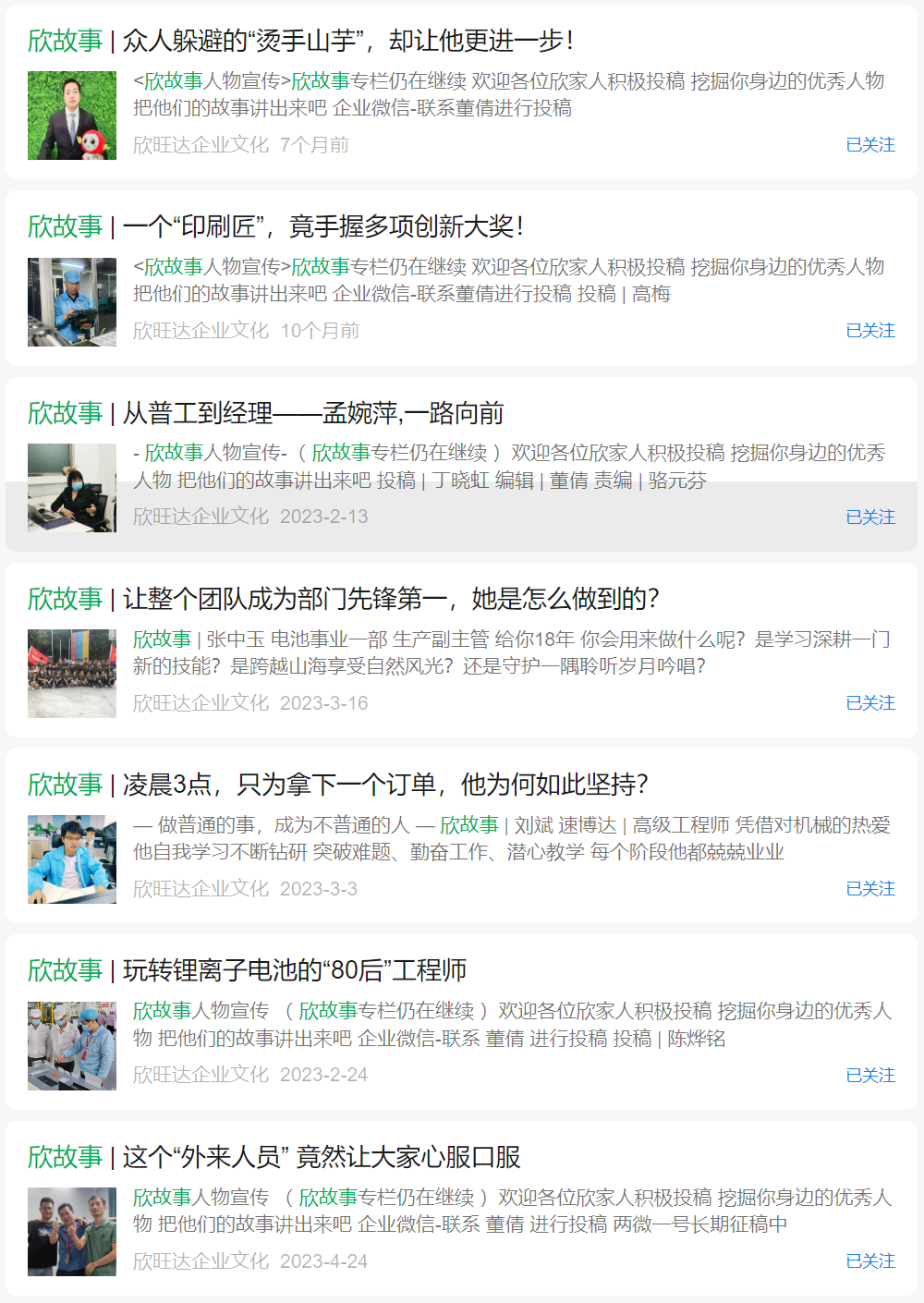 欣旺达同样在自己的企业文化公众号上开设了“欣故事”专栏,鼓励大家投稿身边优秀任务的故事,把他们的故事讲出来,让更多人知道。