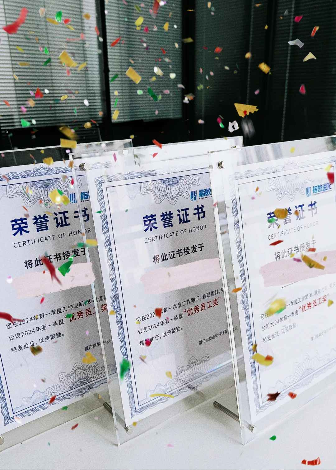指数进化前段时间举办了2024年第一季度表彰会,在季度表彰会上,对上季度表现卓越的员工进行了表彰,为他们颁发了奖状和现金红包,并致以而最热烈的掌声。