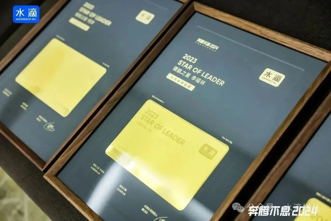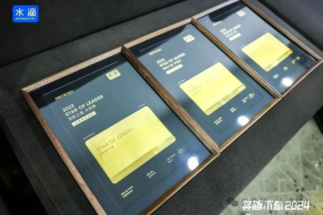 水滴在2023年度荣誉表彰中,设置了“水滴之星”、“领航之星”、“最佳业绩突破奖”等,特别为水滴之星和领航之星定制了金卡,材质为999纯黄金,上面刻有获奖信息,非常具有收藏意义!