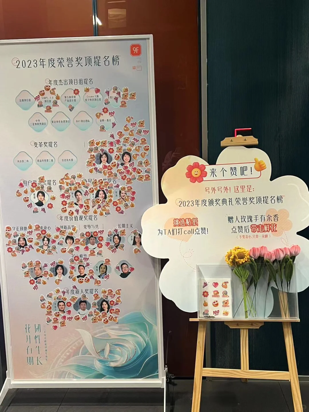 除了表彰会上的创新,表彰前的预热也很关键。大家还可以参考下面这位小伙伴的做法,在提名阶段设计有优秀员工的易拉宝,展示在公共区域,其他小伙伴可以通过自助拿贴纸,给自己心仪的提名伙伴打call,并拿走一支毛线花,贴纸贴多少对结果没影响,主打就是线下把氛围和关注做起来,而且这样还可以拉高大家对表彰会的期待。