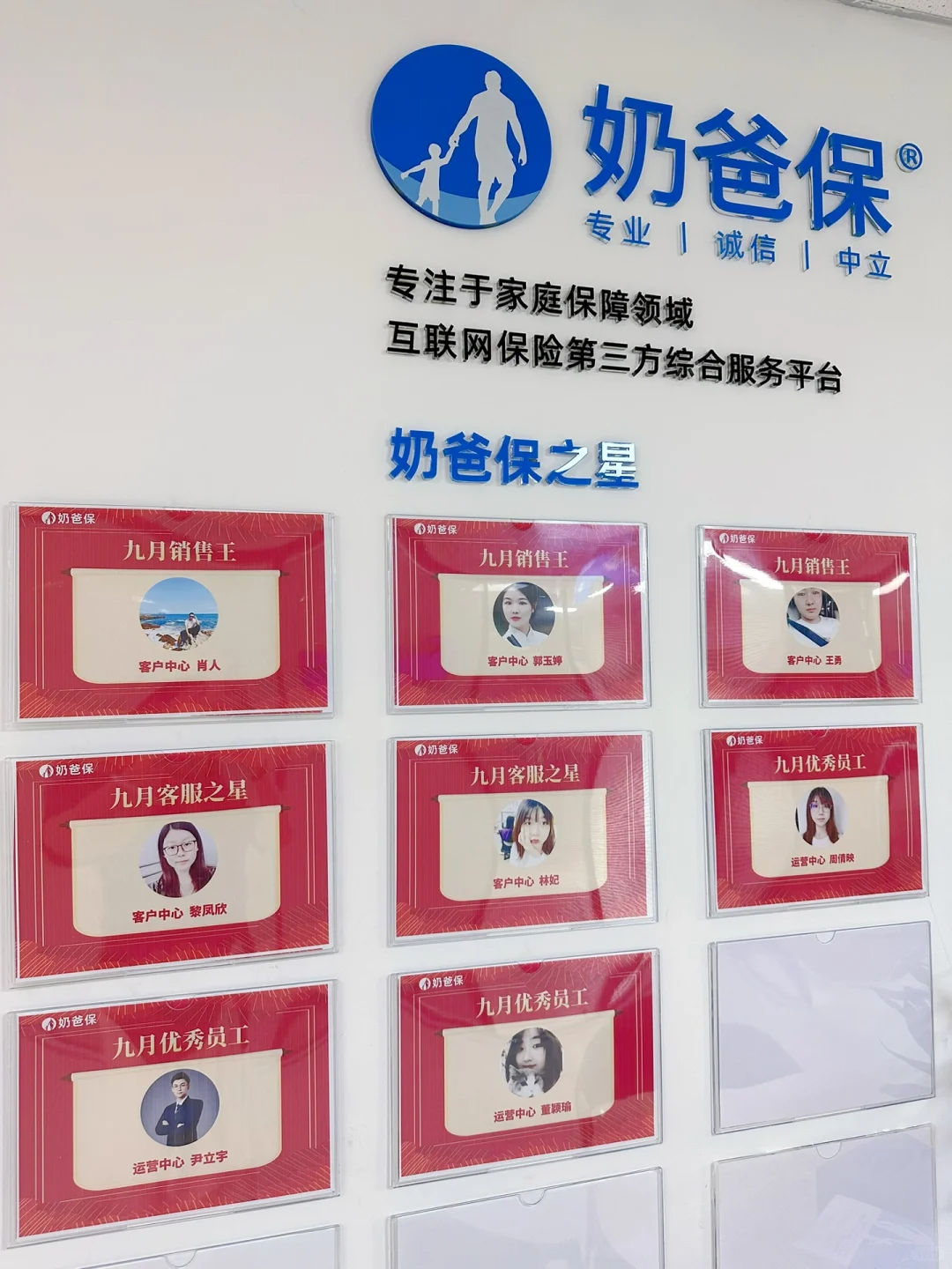 奶爸保将办公室的文化墙设置成了优秀员工展示墙和员工荣誉墙,每月的优秀员工展示墙和员工荣誉墙,不仅可以用来记录小伙伴们拿到荣誉证书时的喜悦和开心,还可以激励其他小伙伴向这些员工看齐。
