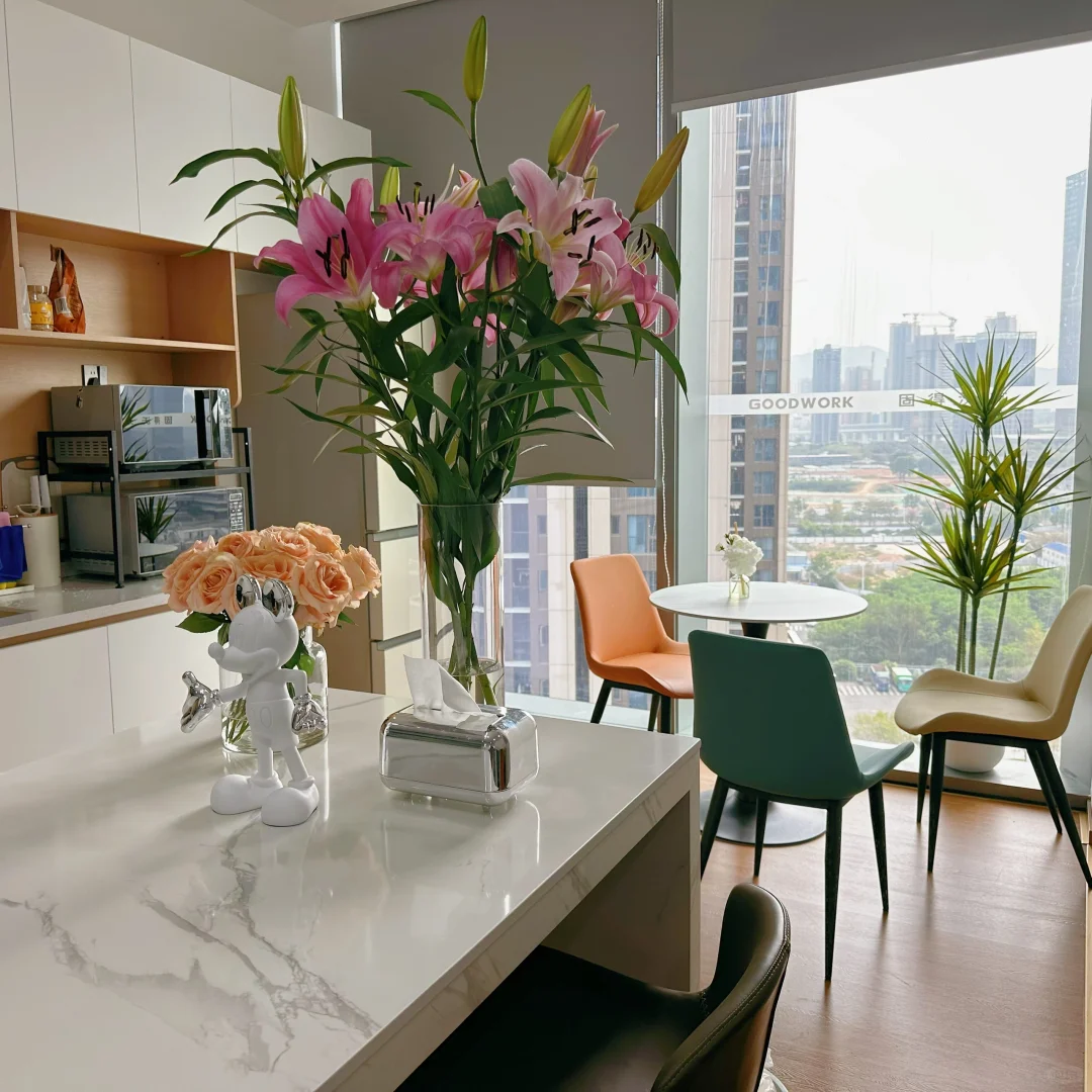 其他公司的茶水间的吧台上摆放了几盆花卉绿植,显得十分优雅。