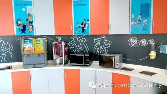 还有腾讯公司的茶水间墙壁上也是设计了不少的创意图案,让员工们在喝茶休息时,可以发散思维,头脑风暴。