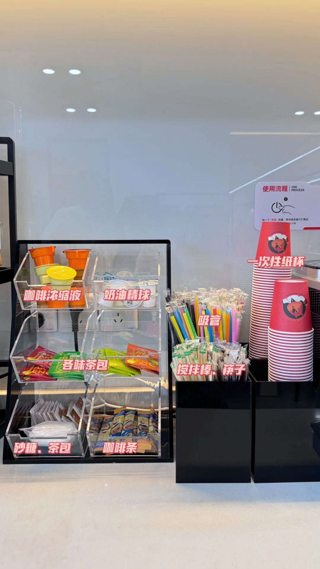 像玺承公司的茶水间准备了一系列员工饮水喝茶等会用到的一次性纸杯、吸管、搅拌棍、筷子等用品,咖啡浓缩液、奶油球、砂糖包、茶包和咖啡条等饮品调理品,一侧架子上也摆放了不少茶叶罐头供员工们选择。