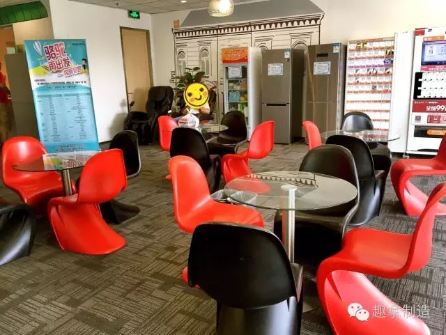 再比如去哪儿网的茶水间,统一采用了红黑相间的座椅↓