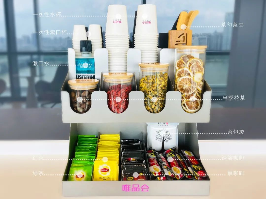 唯品会茶水间一个架子就搞定系列茶饮用品:一次性水杯、一次性漱口杯、漱口水、茶勺茶夹、当季花茶、茶包袋、速溶咖啡、黑咖啡、红茶和绿茶等等。