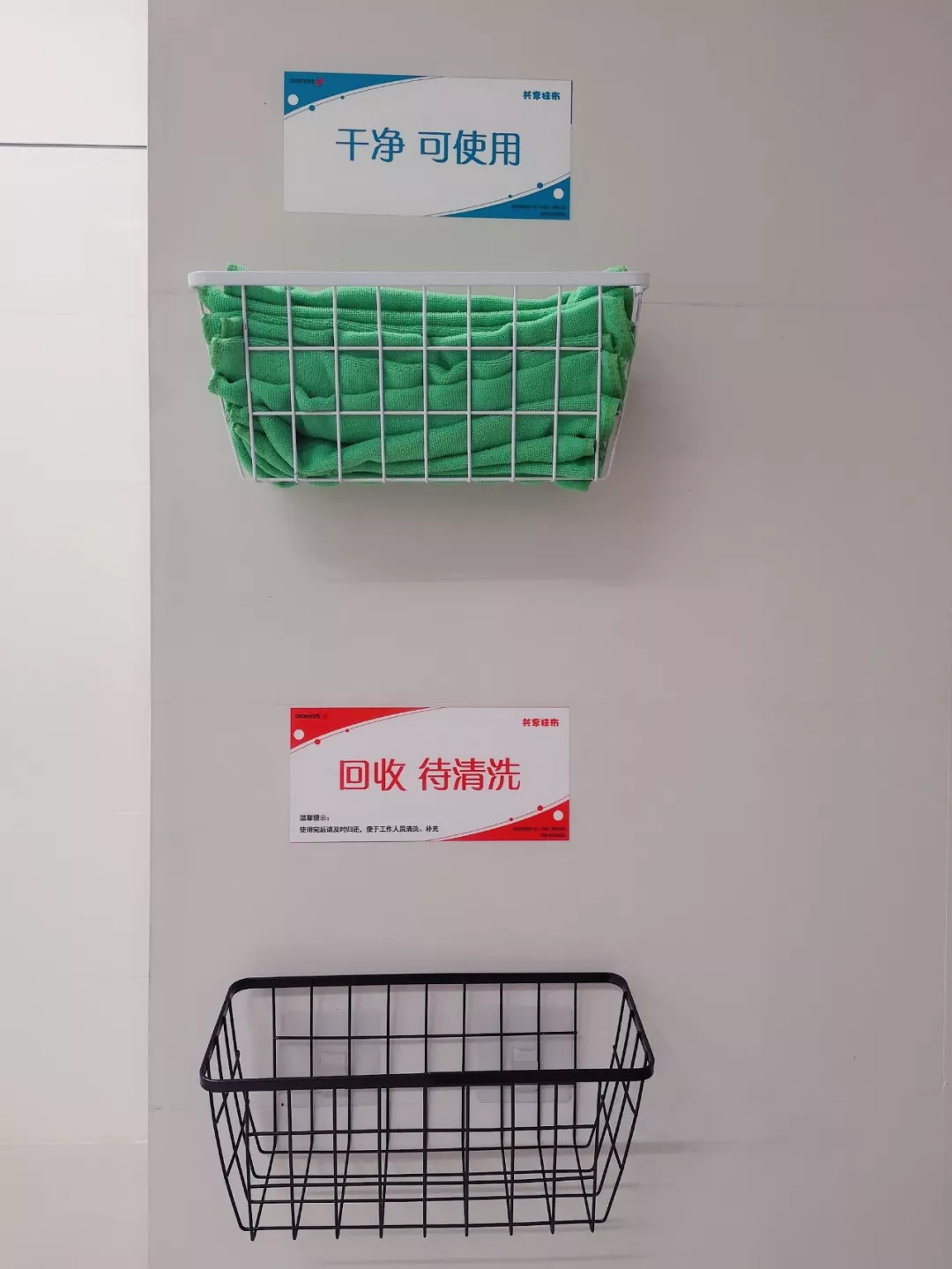 再比如华为考虑到员工们办公桌面脏乱,但保洁阿姨来不及清洁的情况。在每个茶水间放置了共享抹布,保洁大姐会定期补充干净抹布,同时也会集中对污染的抹布进行回收,消毒清洗。