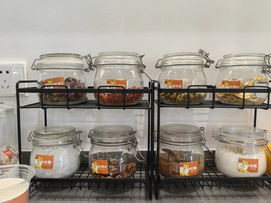 像是新创娱游的茶水间准备了各式各样的花茶果茶茶叶,可以选择搭配好的花果茶,也可以按照个人口味自行DIY。
