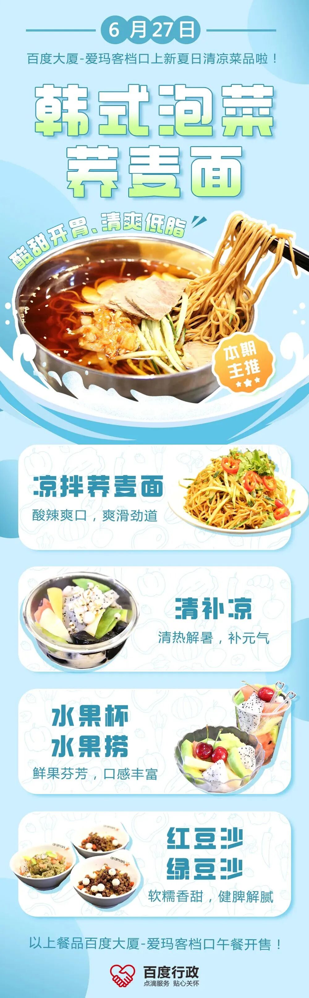 比如百度在夏季推出的一系列清凉菜品,韩式泡菜荞麦面、凉拌荞麦面、水果捞等美食,帮助员工们消暑开胃,满血复活!