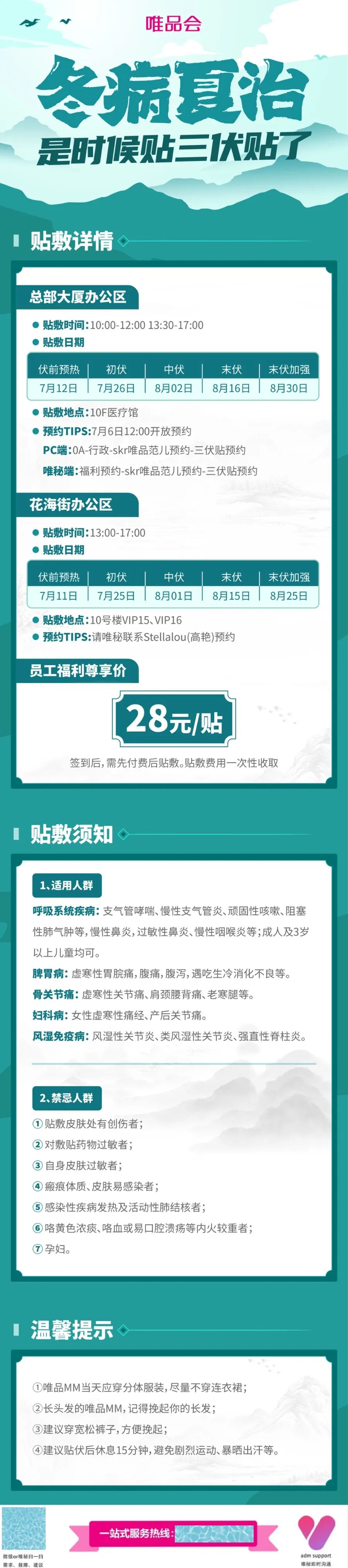 例如唯品会在三伏天前中后期开放“三伏贴”贴敷服务预约,并且贴心地告知了适用人群和禁忌人群等温馨提示。