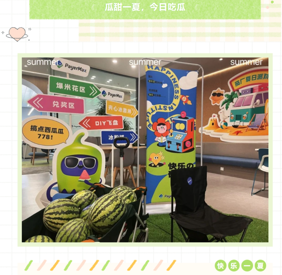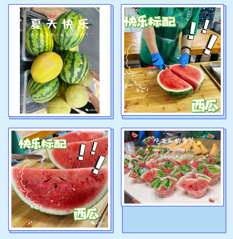 贝塔科技行政部每日中午都会在休息区安排切好的冰镇西瓜,还有冰镇香蕉和水蜜桃,冰爽甜蜜一个夏天。
