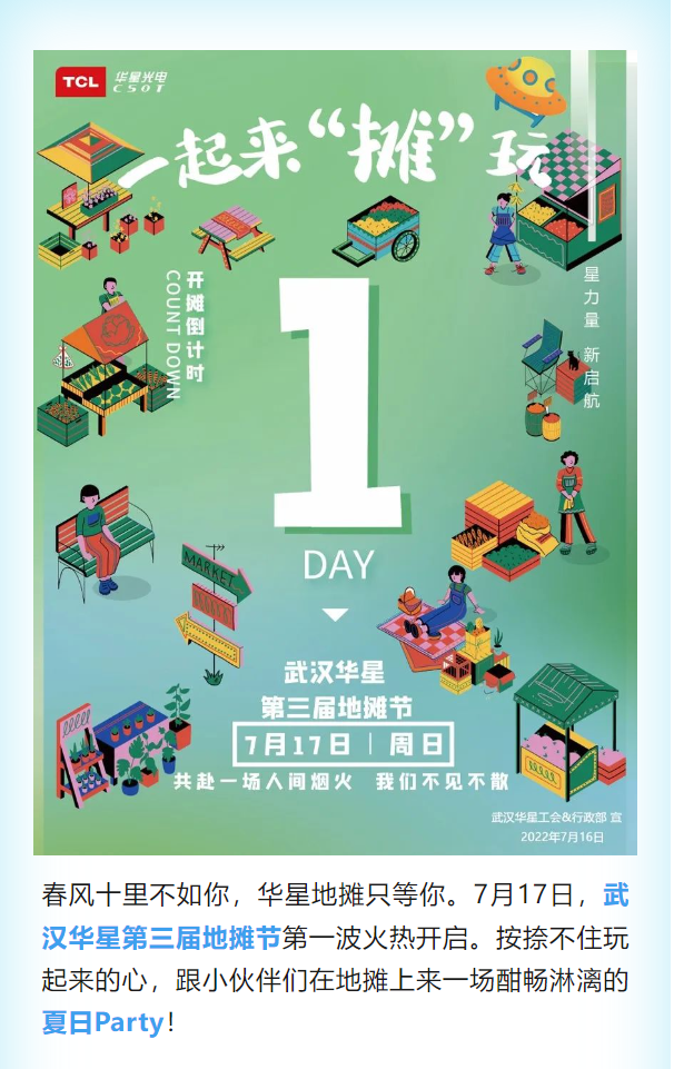 夏季和集市/地摊等主题也十分搭调,像华星光电为了丰富员工的业余生活,举办了“‘摊’玩一夏”的地摊节活动。出场商户大牌云集,吃的喝的玩的样样都有,员工们都可以享受最低折扣,体验集市买买买的乐趣。