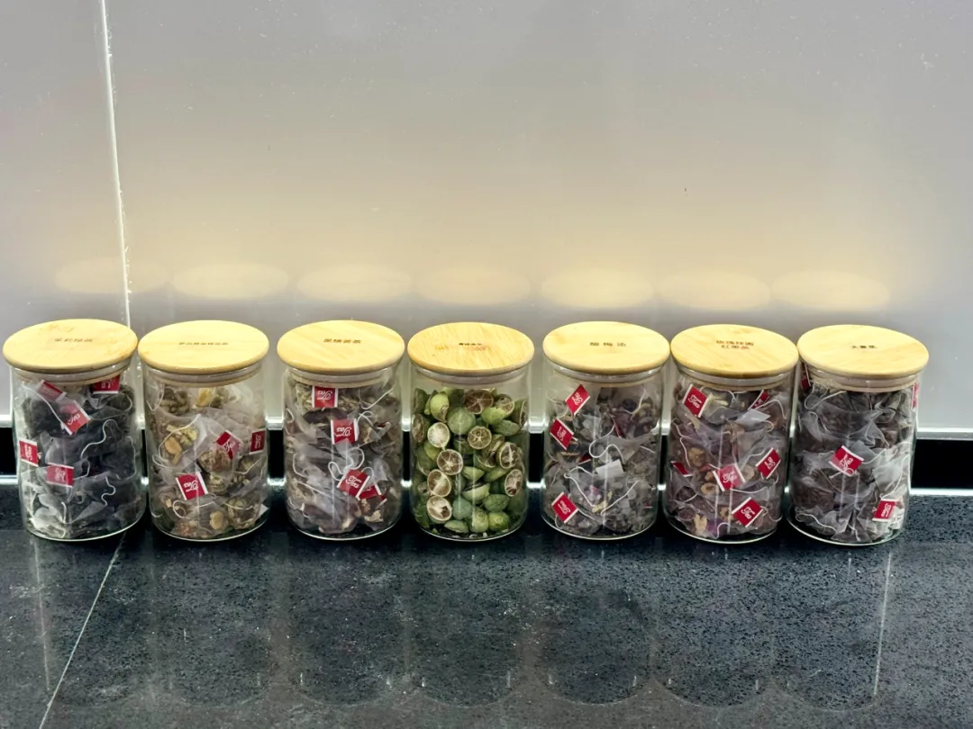 茶水间也准备了不少花茶果茶茶叶,可以选择搭配好的花果茶,也可以按照个人口味自行DIY。