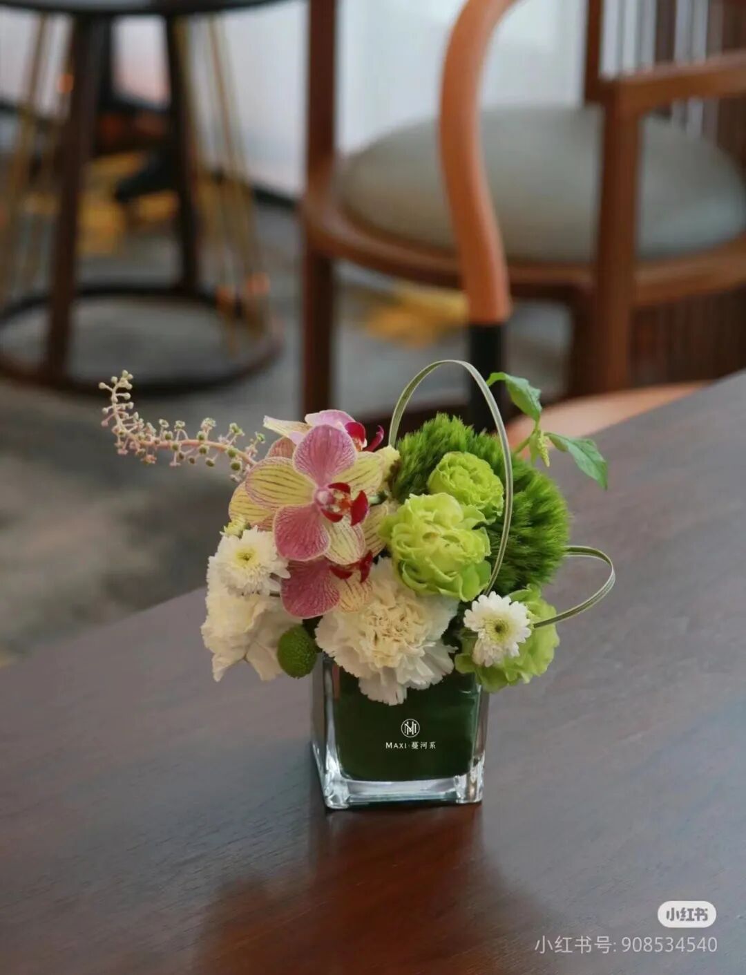 长期使用白绿色花卉可能会显得有些单调,偶尔选用一些色彩清新素雅的桌花,也会给办公室会带来一些不一样的感受。