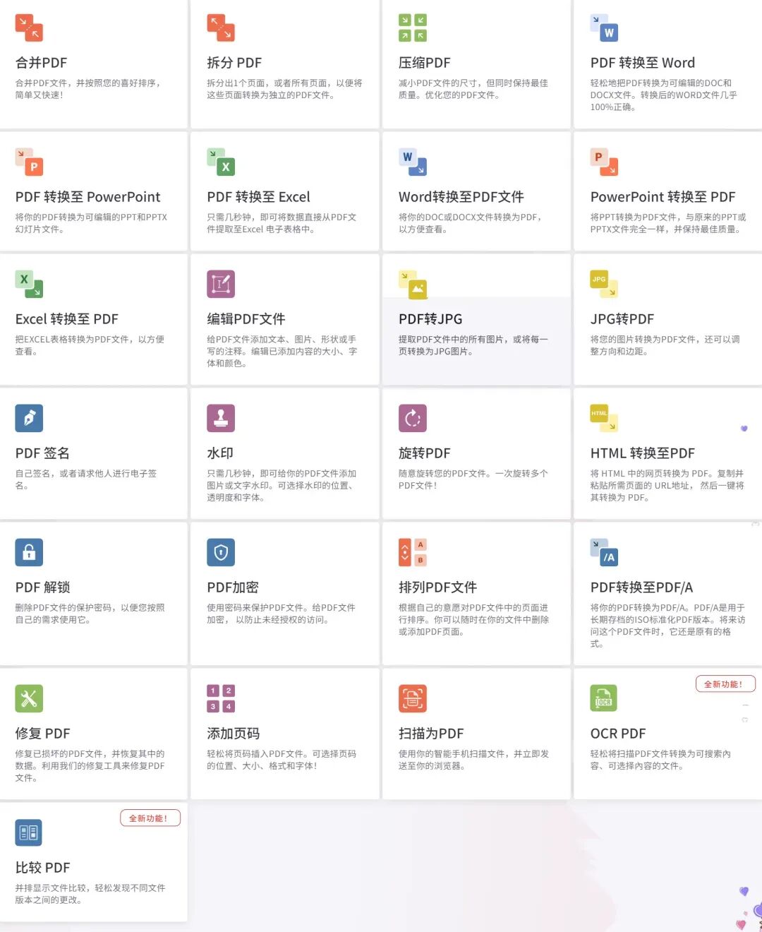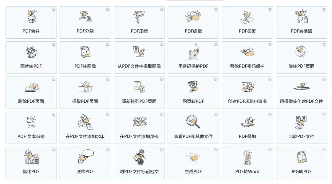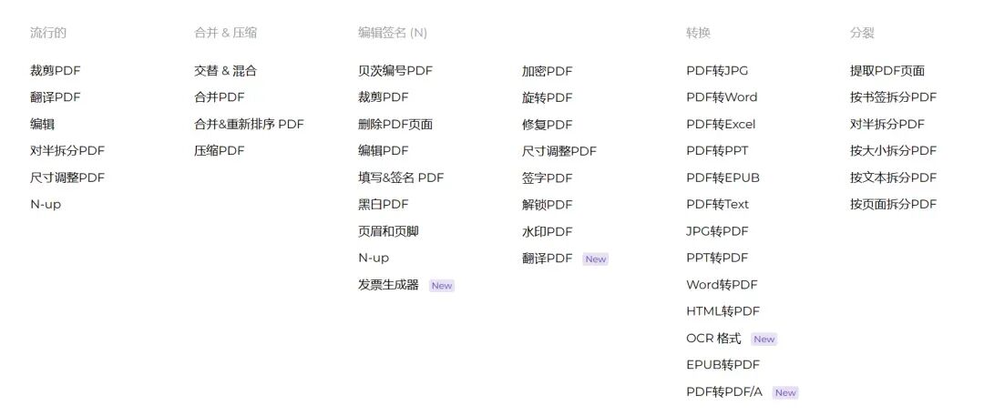 完全免费、易于使用、丰富的PDF处理工具,包括:合并、拆分、压缩、转换、旋转和解锁PDF文件,以及给PDF文件添加水印的工具等。