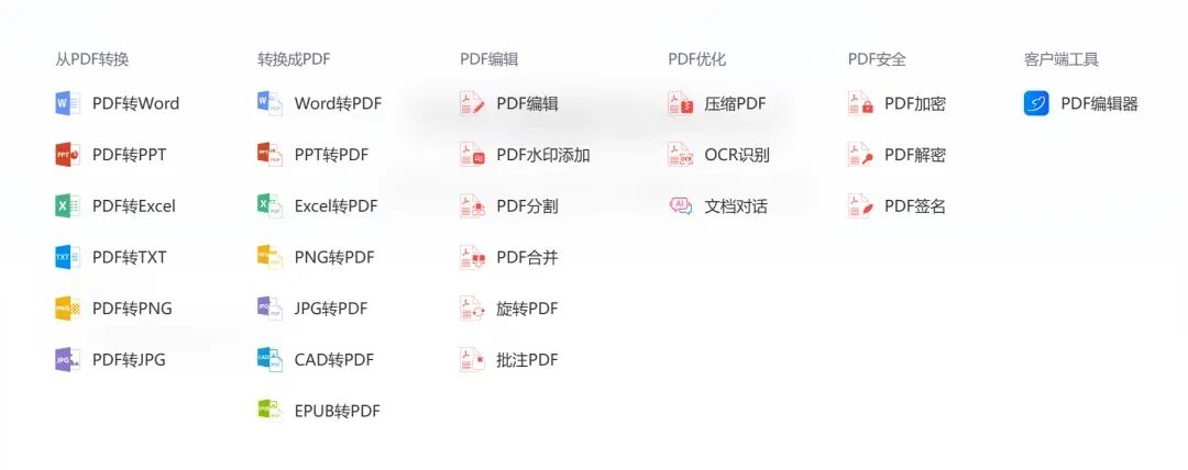 无需登录注册,支持PDF 合并、分割、编辑、压缩、格式转换(Word、Excel、图片等)、OCR 文本识别、添加水印等,而且所有功能都可以免费使用,没有文件大小等任何限制。