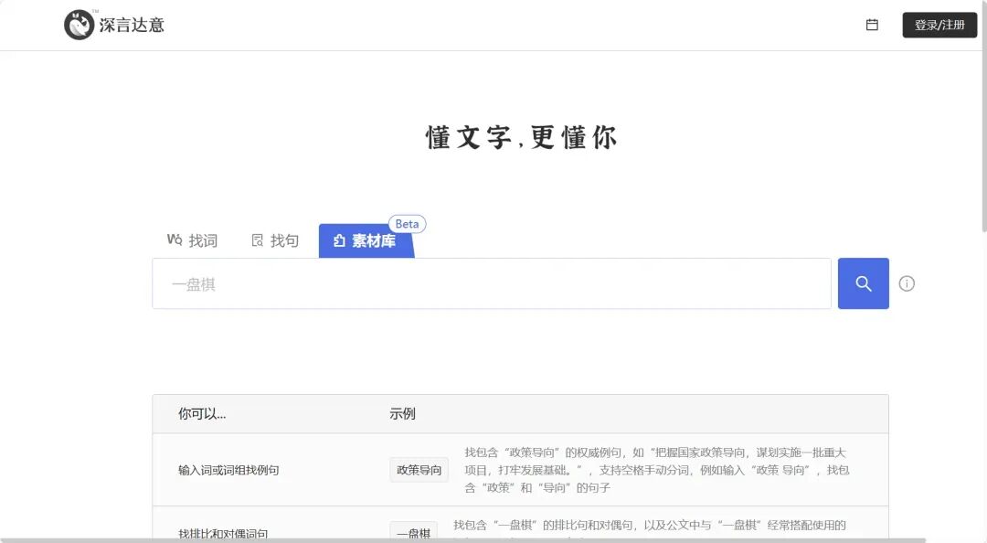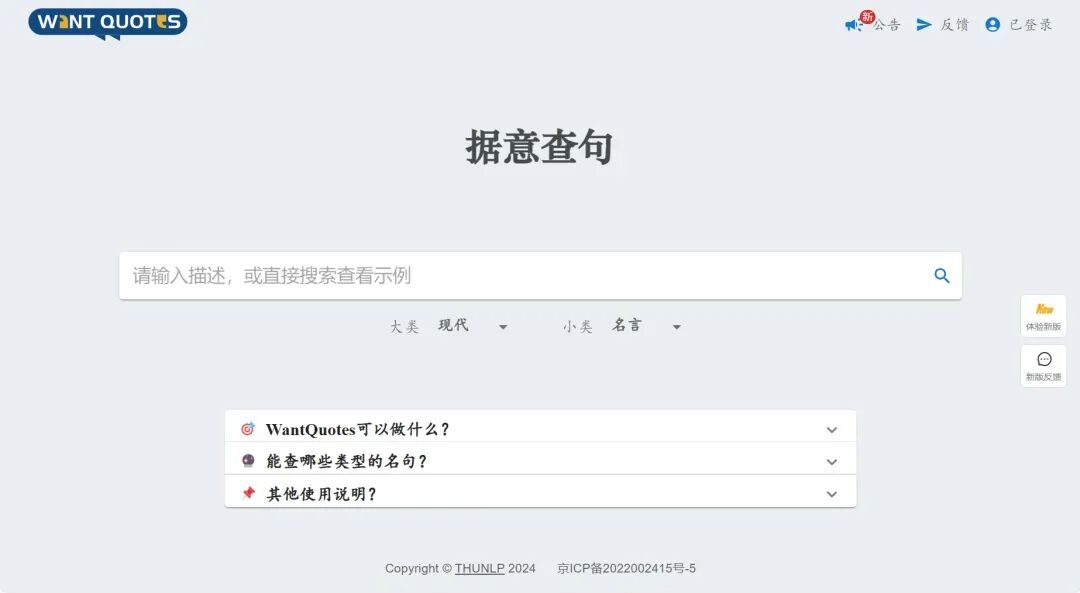 这个网站可以根据输入描述的意思来查找相应的名言名句,首次使用需登录,免费使用。