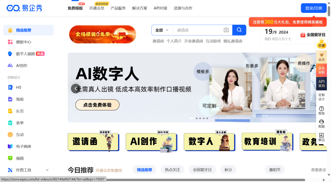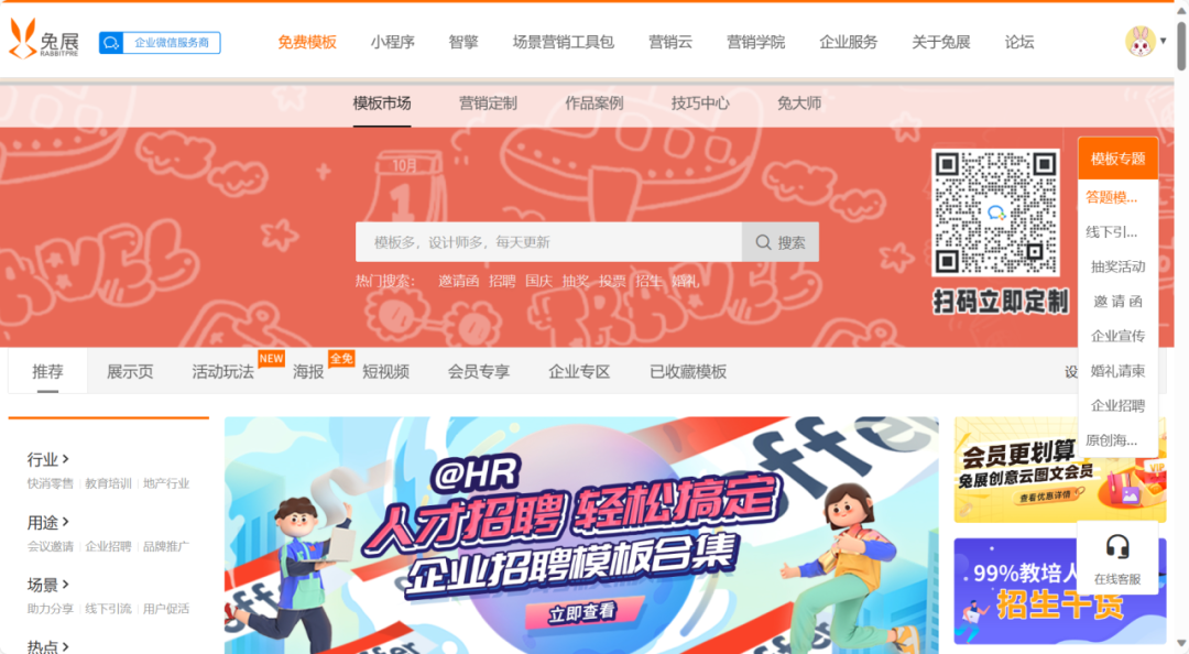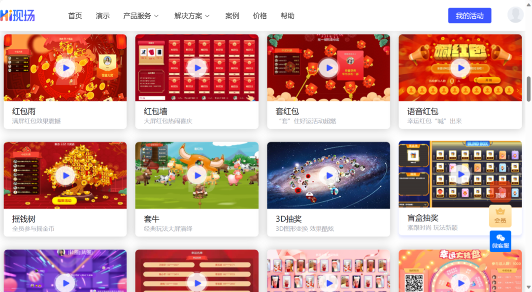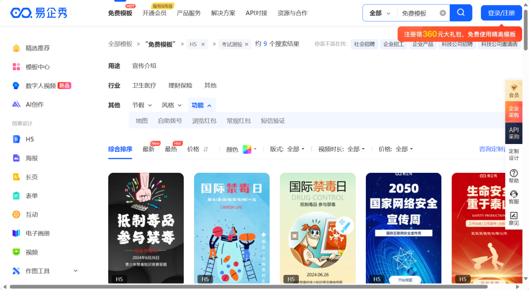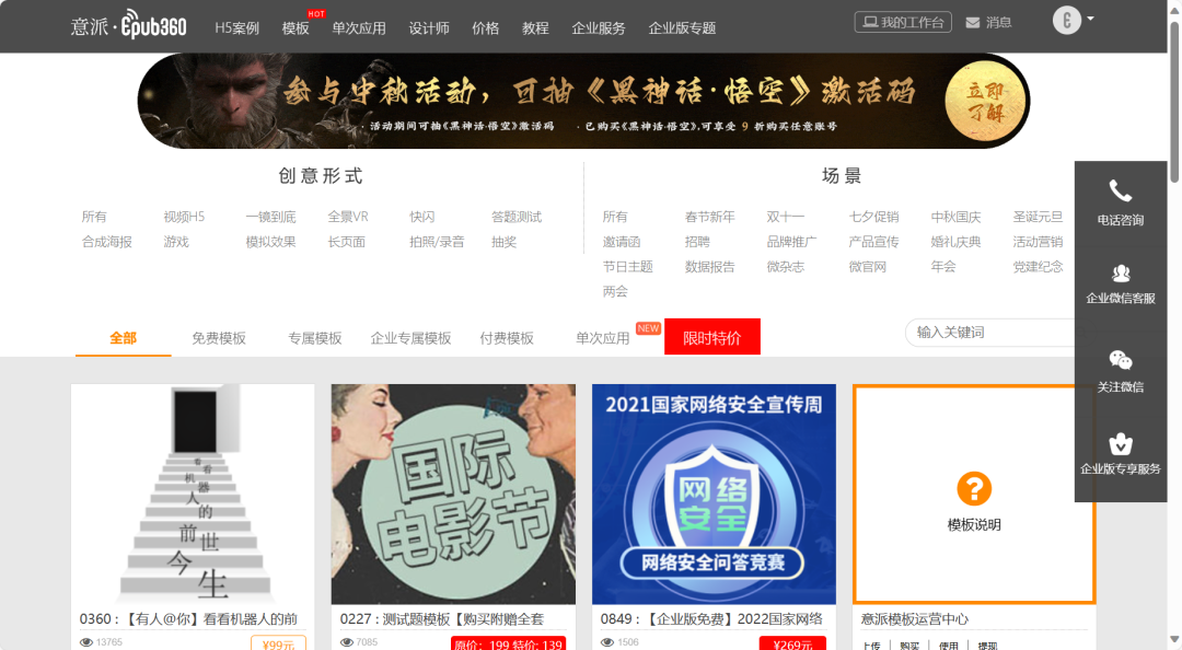 易企秀有非常丰富的模板库,包括各类企业宣传、活动邀请、产品展示等场景。它支持快速生成H5页面,并且提供多种动画效果和交互功能,有免费模版和需要开通会员才可以用的模版。