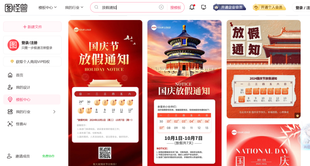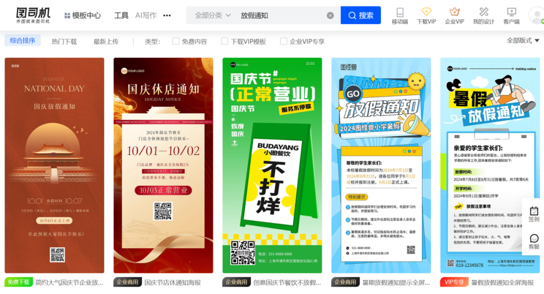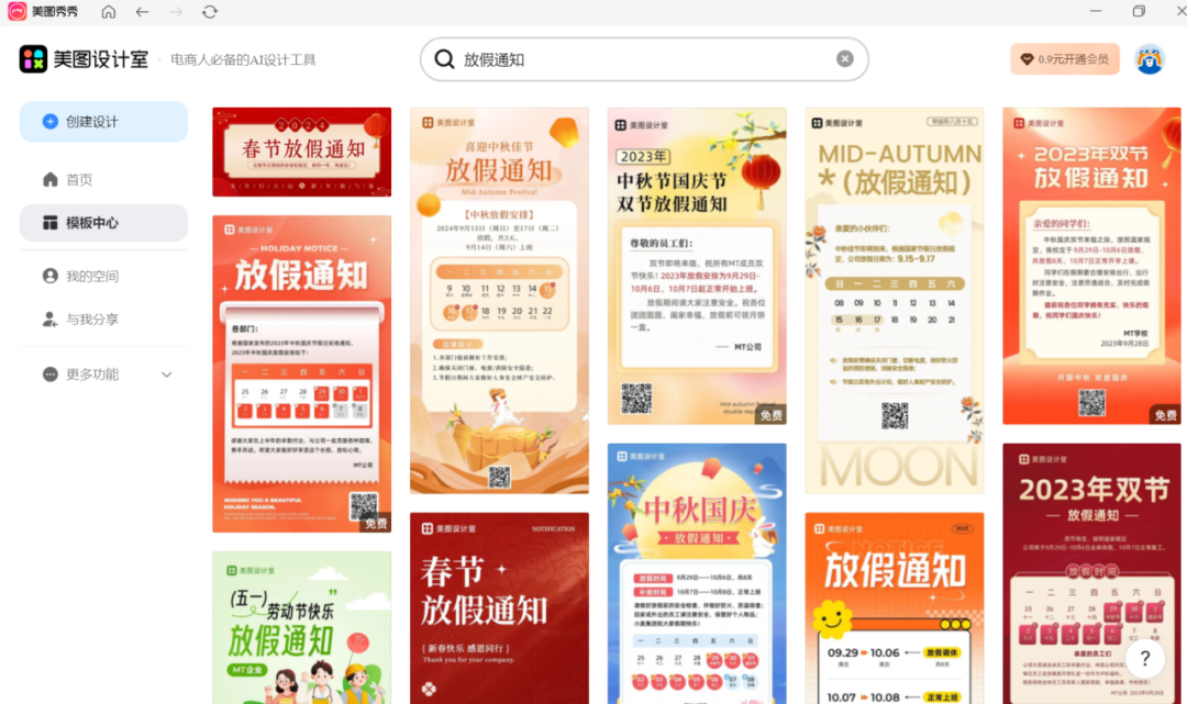 美图秀秀不仅是强大的修图软件,还有制作海报的功能,小知试着搜索了一下“放假通知”这个关键词,能够看到有很多模版,对内容进行简单的修改即可,不过有些是免费的,有些需要开通会员才可以。