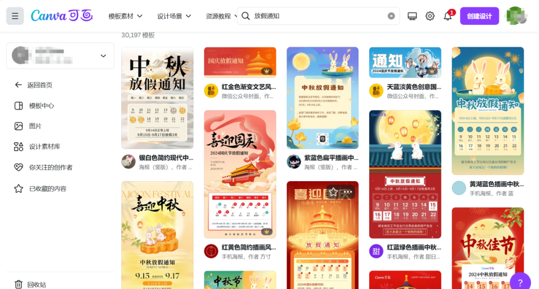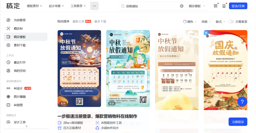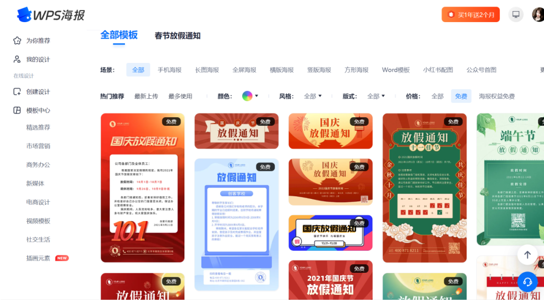 稿定设计部分素材免费,涉及各行各业,海报,封面等全都有。