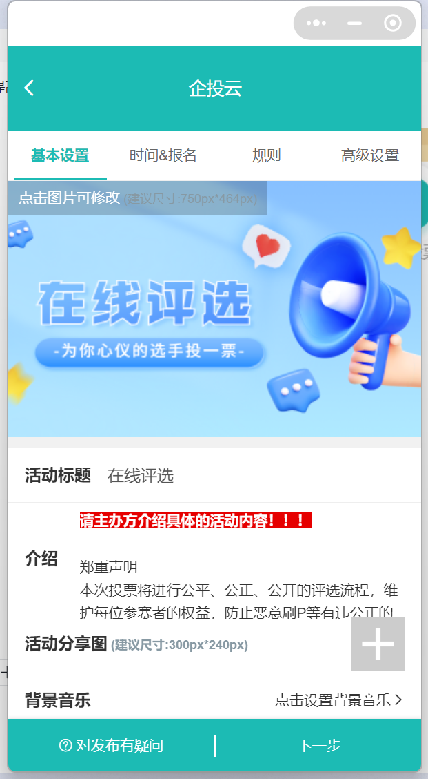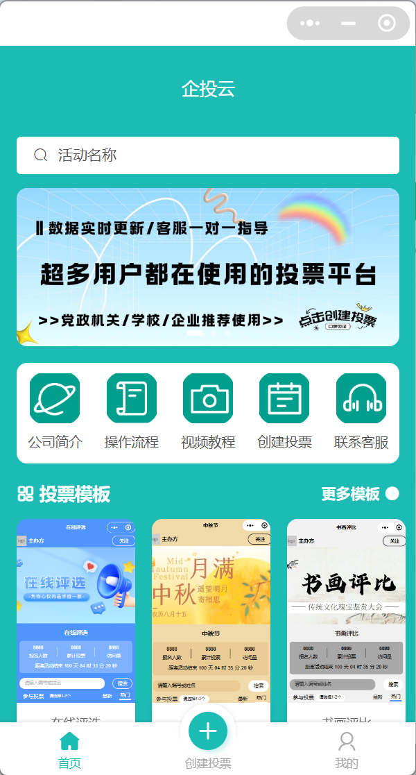 企投云支持图片、文字、视频多种类型的投票,数据实时更新,具有很高的公正性。活动模板较多,提供人工客服。但存在的不足是投票的时候不支持电脑端。