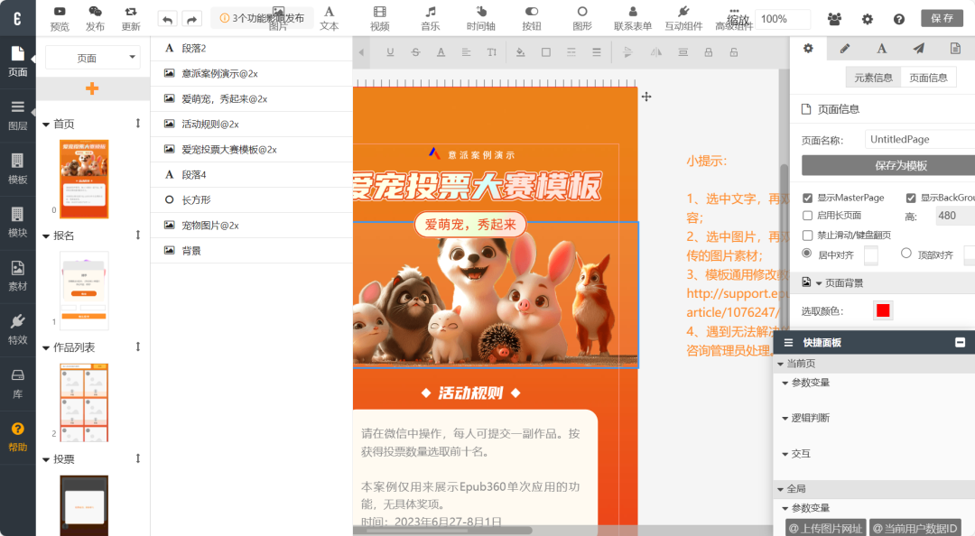 意派Epub360 H5编辑器的整体页面简洁,大部分功能都是可以免费使用的,但是有些需要按模板或者开全站会员。